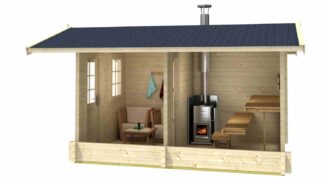 Set uključuje kompletne drvene panele, prozore, vrata, podne daske, pribor za montažu i uputstvo. Nije uključena peć i krovna pokrivenost – one se biraju po želji i moraju biti u skladu sa građevinskim propisima.