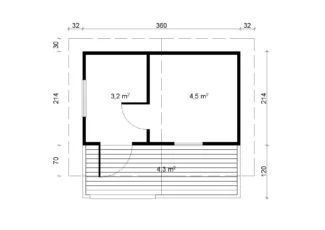 Sauna Hannu je dimenzija 380 × 200 cm sa dodatnih 110 cm terase – ukupno 11,8 m² unutrašnje površine, izrađena od nordijske smreke i dizajnirana da pruži savršenu kombinaciju komfora, estetike i funkcionalnosti za dvorište ili vikendicu.