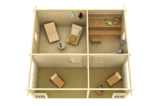 Prednosti: kompaktan projekat, lako se uklapa u manje vanjske prostore, izuzetna toplotna izolacija i kvalitetna drvena izrada – idealno za privatnu upotrebu tokom cele godine.