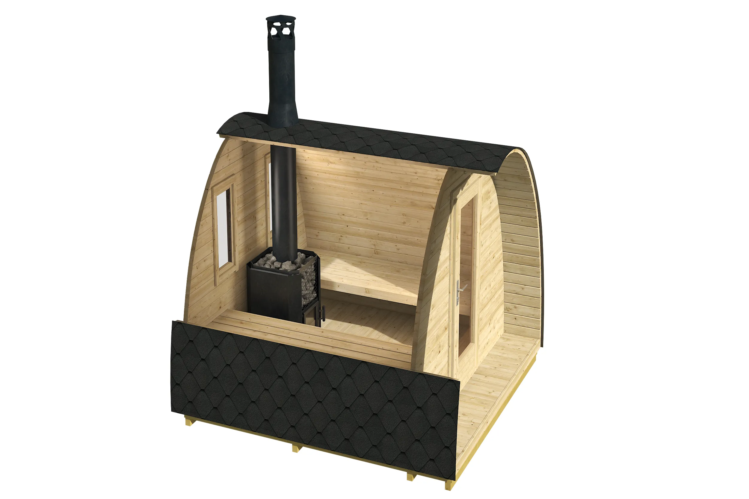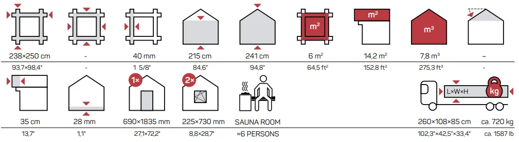 Spoljne dimenzije su 238 x 250 cm, težina oko 1200 kg, što čini ovu saunu savršenom za 2 do 4 osobe i jednostavnu integraciju u gotovo svaki prostor.