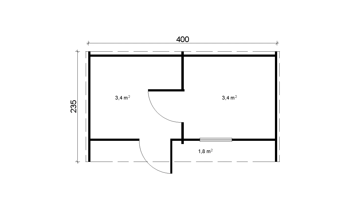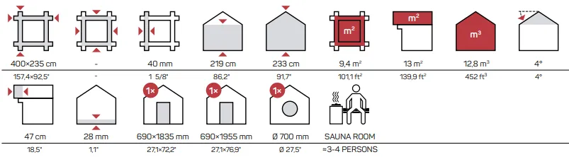 Spoljne dimenzije saune su 235 x 400 cm, težina oko 1200 kg, dok zidovi debljine 40 mm garantuju odličnu termoizolaciju i stabilnost konstrukcije.