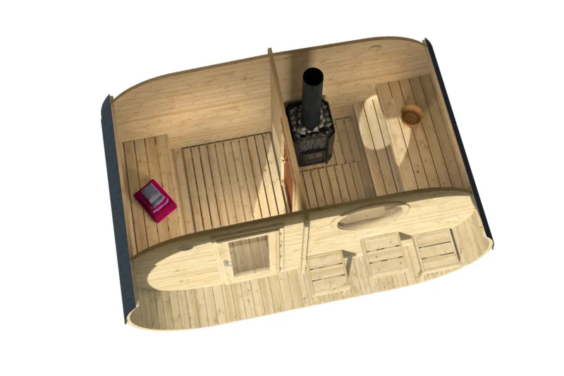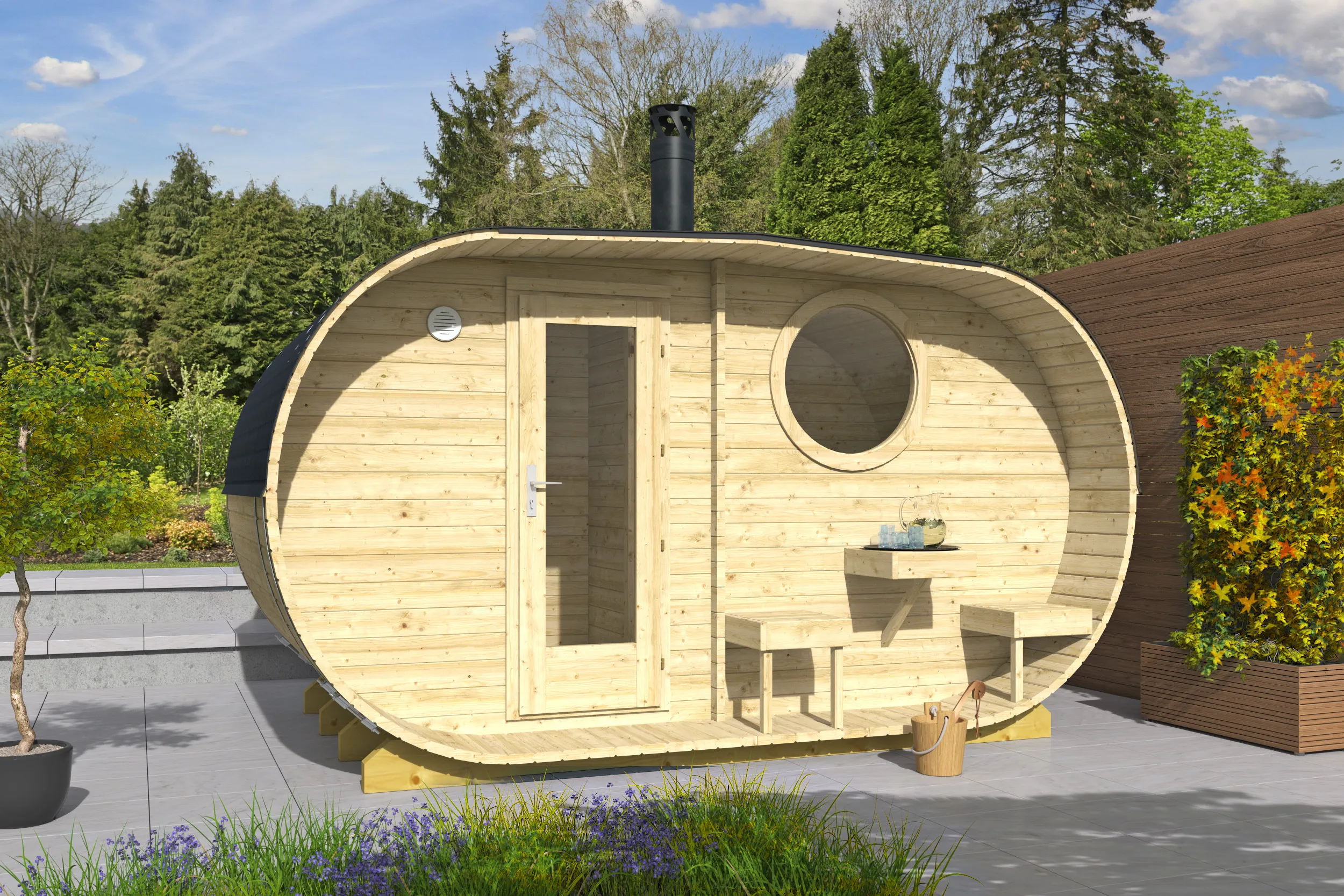 Bačvasta sauna Forssa je elegantno zaobljena, funkcionalna sauna sa dve odvojene prostorije – predsobljem za presvlačenje i prostranom parnom sobom. Sa dodatkom drvene terase i prirodnih materijala, predstavlja idealan izbor za stvaranje ličnog wellness kutka u dvorištu, pored bazena ili vikendice.