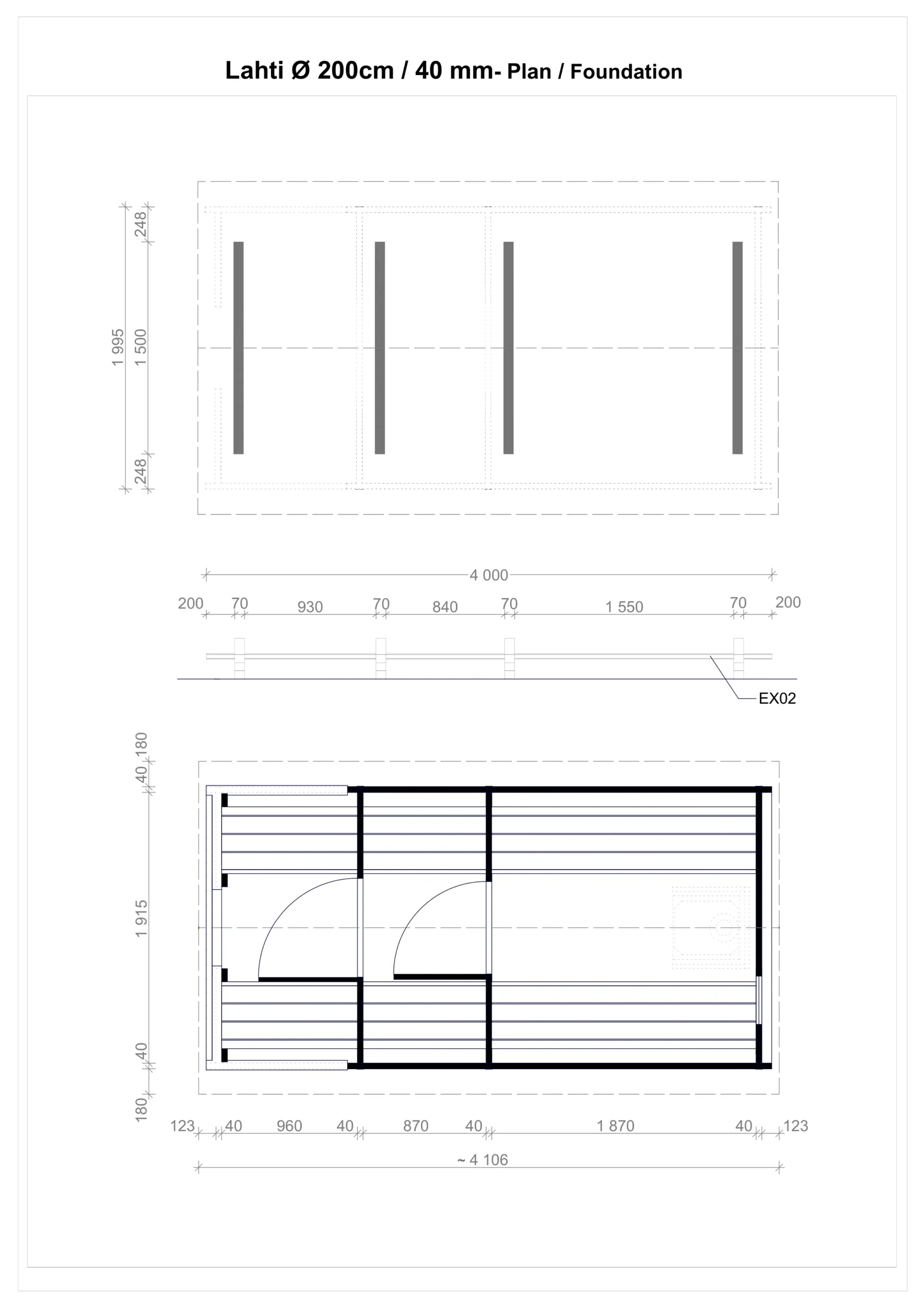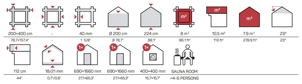 Dimenzije saune su 200 x 400 cm, težine oko 1200 kg – idealna za brzo postavljanje i momentalnu upotrebu.