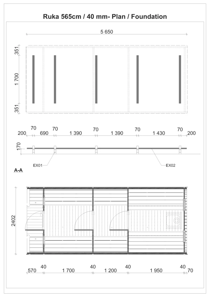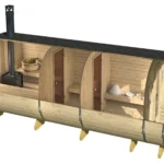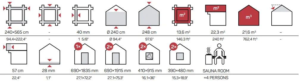 Dimenzije saune iznose 240 x 565 cm sa zidovima debljine 40 mm, što pruža odličnu izolaciju i dovoljno prostora za grupno sauniranje ili duže sesije uživanja.
