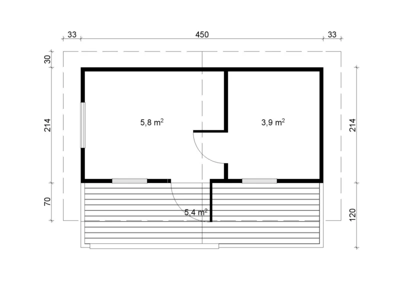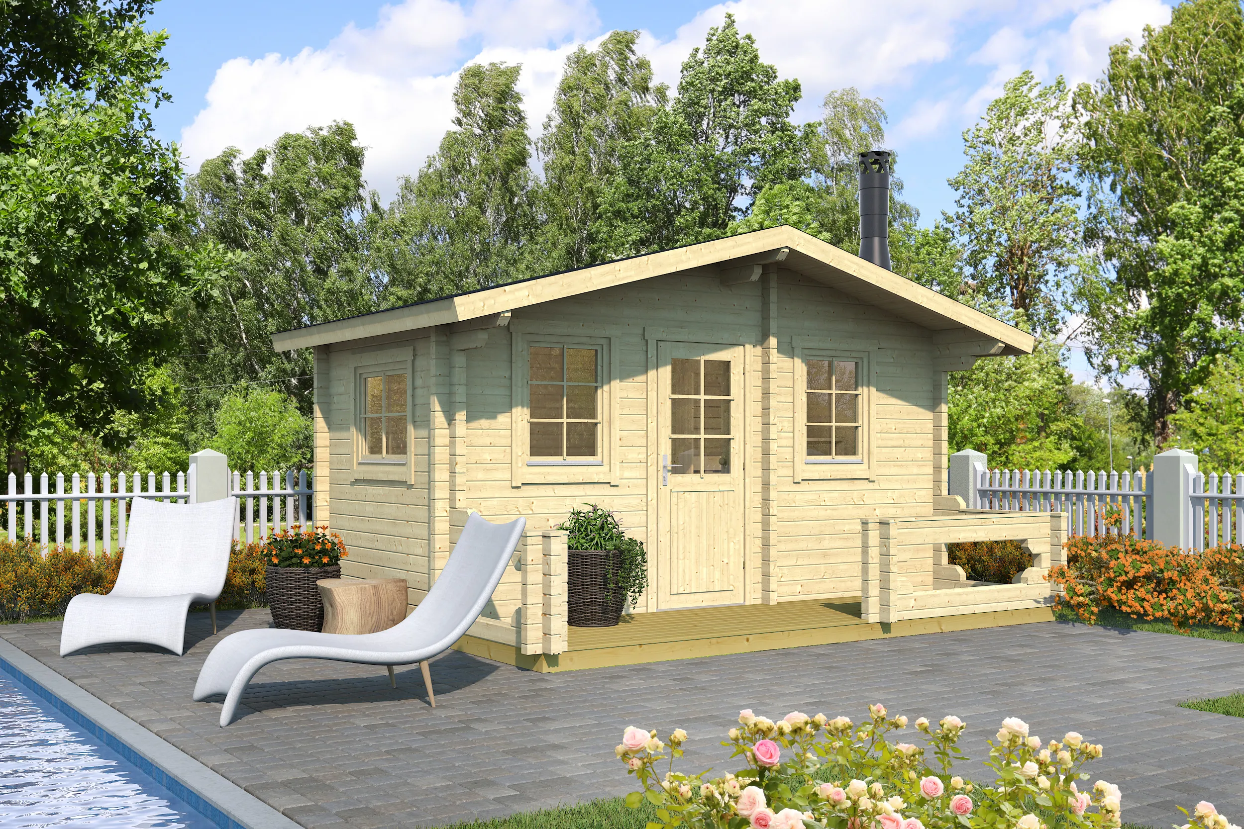 Prednosti: kompaktna, pogodna za manje dvorišne prostore, sa terasom i osnovnom izolacijom zidova – odlična za privatnu upotrebu tokom cele godine.