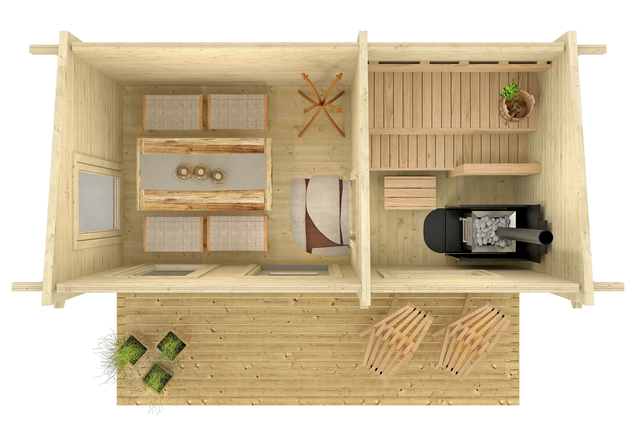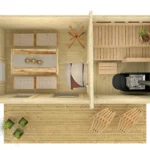 Sauna Hannu je dimenzija 380 × 200 cm sa dodatnih 110 cm terase – ukupno 11,8 m² unutrašnje površine, izrađena od nordijske smreke i dizajnirana da pruži savršenu kombinaciju komfora, estetike i funkcionalnosti za dvorište ili vikendicu.