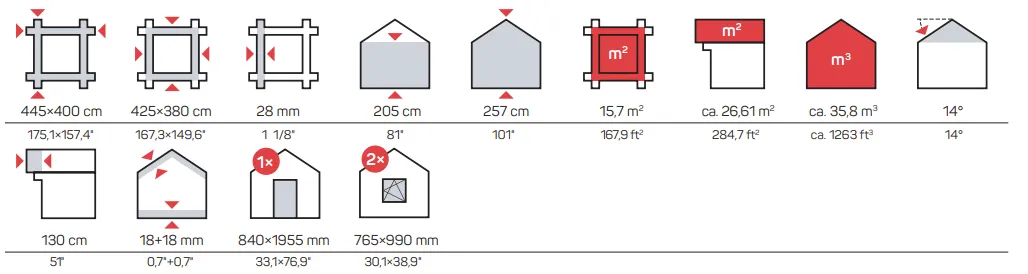 • Spoljašnje dimenzije zida: 425 x 380 cm