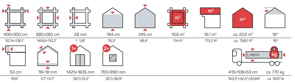 • Spoljašnje dimenzije zida: 380 x 280 cm