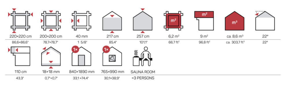 Sauna Hannu je dimenzija 380 × 200 cm sa dodatnih 110 cm terase – ukupno 11,8 m² unutrašnje površine, izrađena od nordijske smreke i dizajnirana da pruži savršenu kombinaciju komfora, estetike i funkcionalnosti za dvorište ili vikendicu.