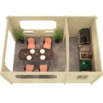 Masivne zidne ploče debljine 70 mm obezbeđuju izvanrednu termičku i zvučnu izolaciju, čineći unutrašnjost savršeno udobnom tokom cele godine. Dvostruka vrata i prozori su izrađeni od posebno sušenog lameliranog drveta sa staklenim paketima i kompletnim okovom za pouzdanu i dugotrajnu upotrebu.
