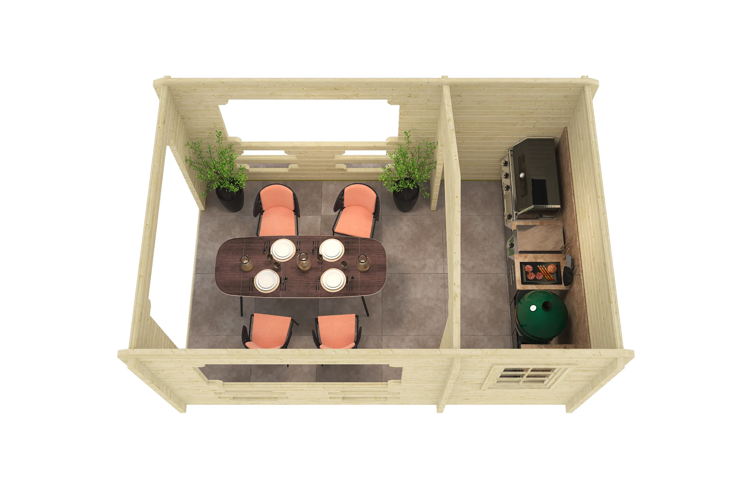 Unutrašnji prostor je dodatno oplemenjen plafonom od profilisane daske debljine 18 mm, dok terasa sa stolom (21 x 95 mm) pruža idealno mesto za predah nakon saune.