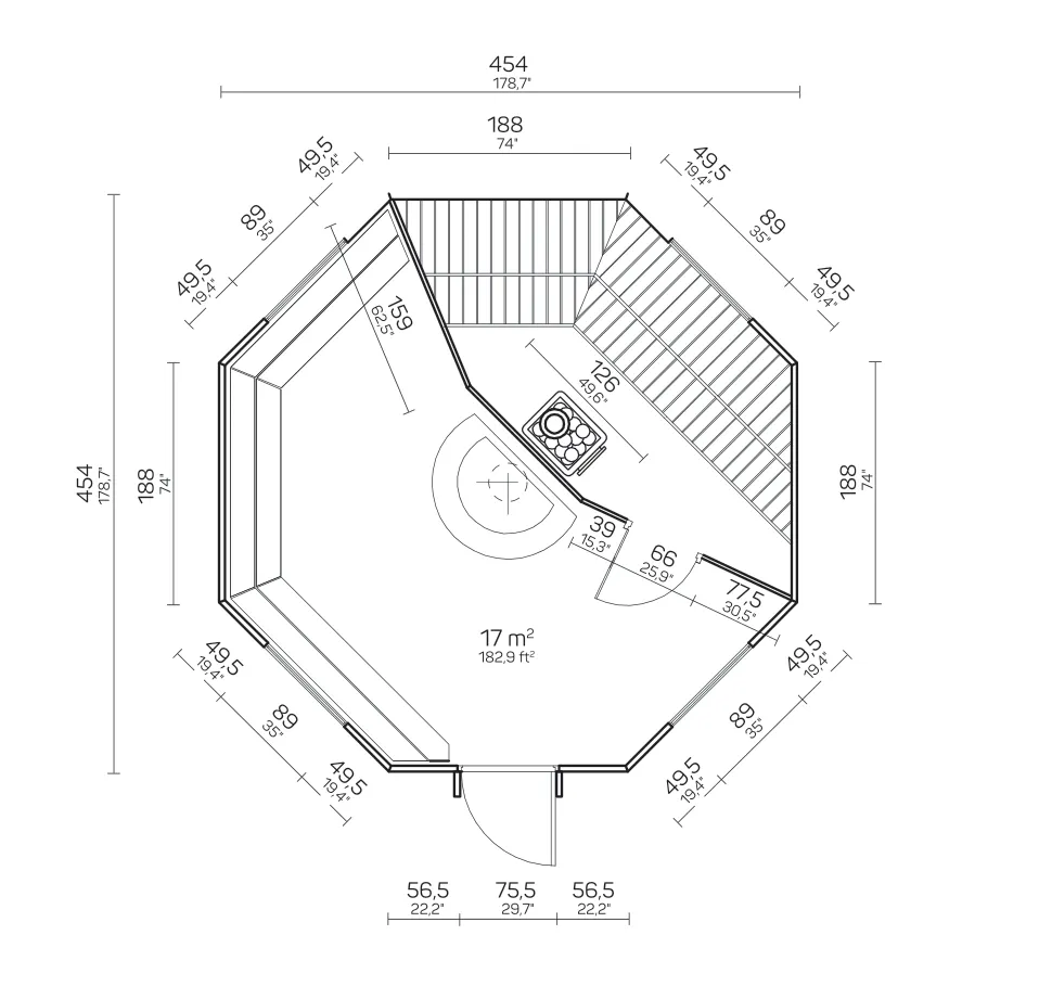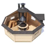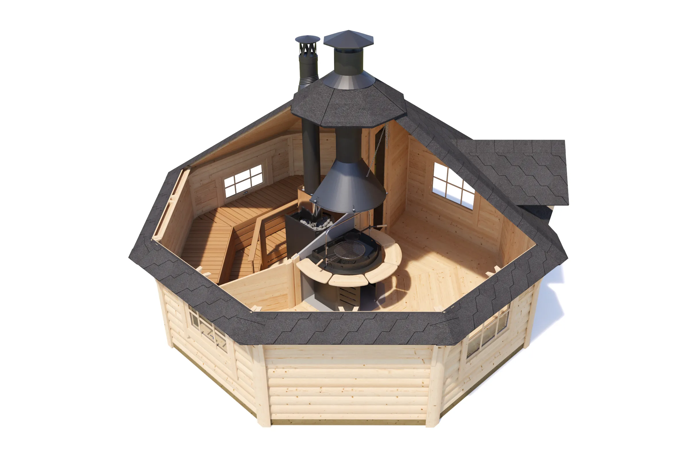 Sauna Kalevi dizajnirana je kao idealan dodatak vašem dvorištu ili vikendici. Debljina zidova 70 mm pruža odličnu toplotnu izolaciju i dugotrajnost. Opremljena je prostranom unutrašnjom saunom za uživanje i natkrivenom terasom za odmor, čime se kombinuju zdravlje i prirodni komfor.