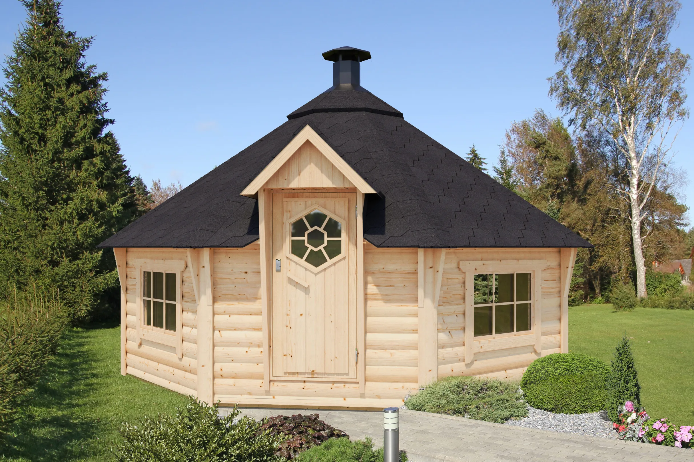 Zidovi debljine 40 mm omogućavaju optimalnu termalnu izolaciju, idealnu za korišćenje tokom cele godine. Dvostruka vrata i prozori izrađeni su od sušenog lameliranog drveta (sa 8–12% vlage), sa staklenim paketima i kvalitetnim okovom – za maksimalnu svetlost, komfor i sigurnost.